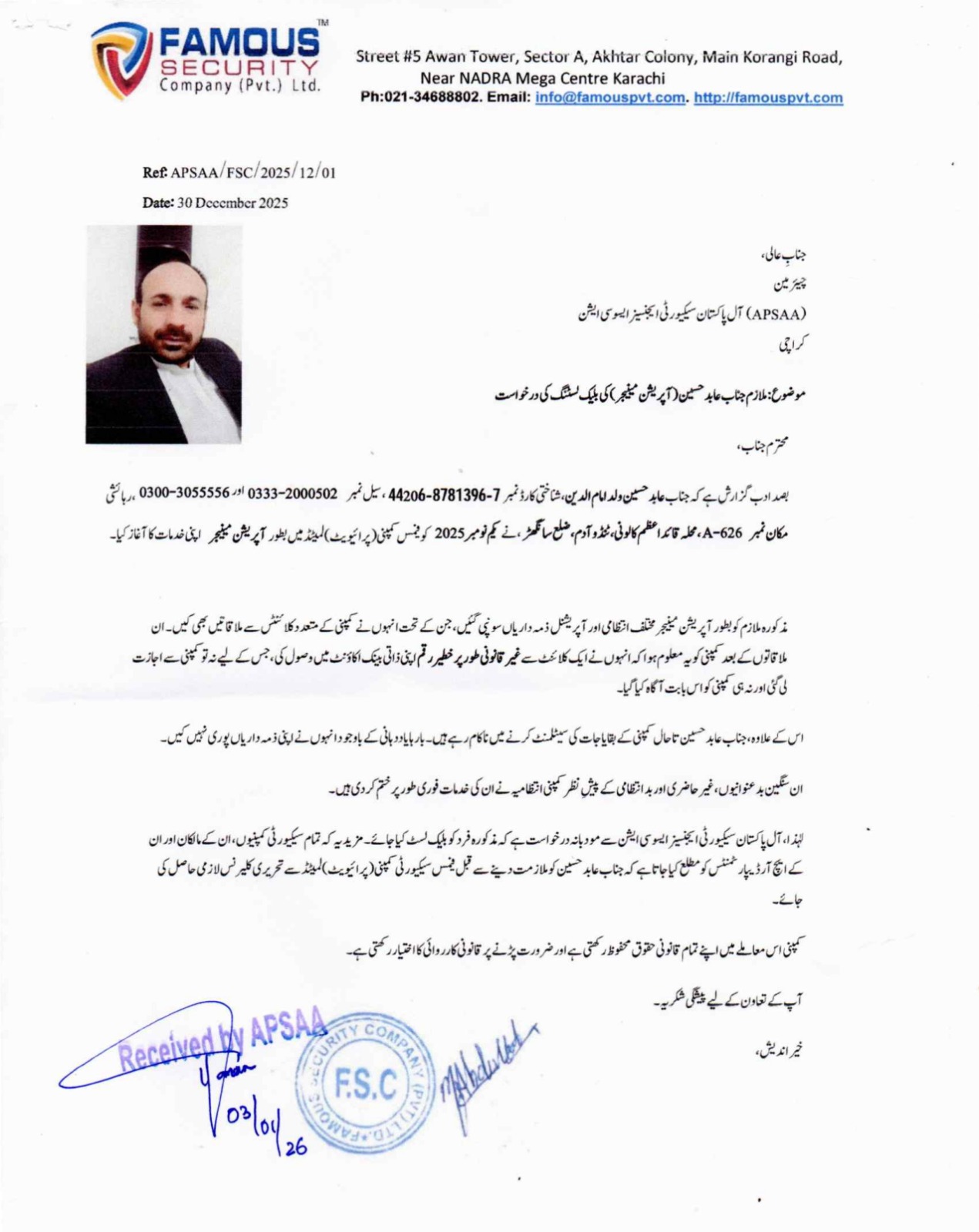 | 01 | Year 2026 | Abid Hussain | Imam Uddin | Famous Security Company (Pvt.) Ltd | 4420687813967 | Click Here |